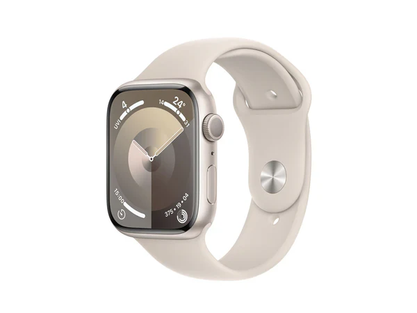 أبل ساعة سيريز 9 - جي بي اس - هيكل من الألومنيوم ستارلايت بقياس 45 ملم مع حزام ستارلايت الرياضي ميديم/لارج